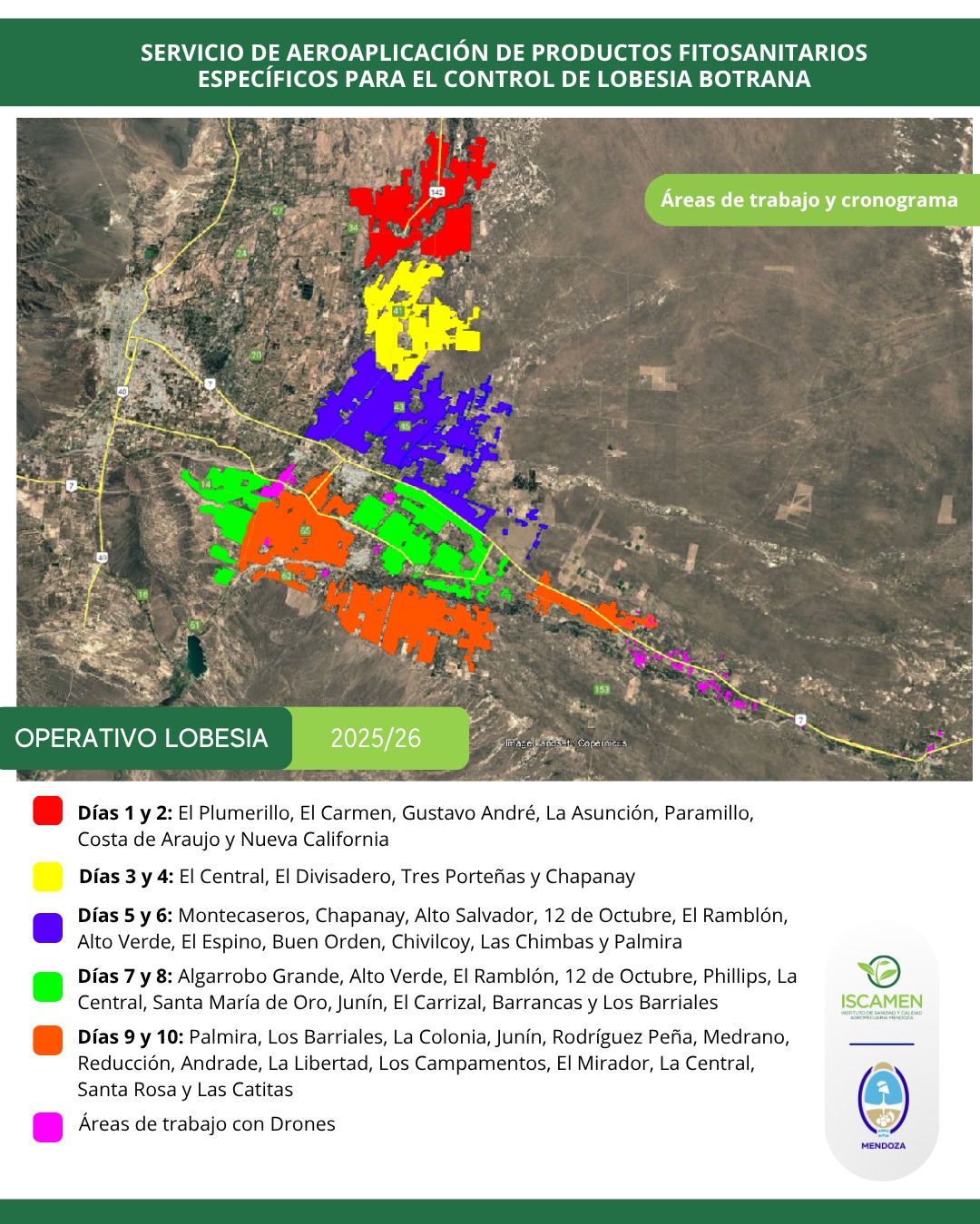 Se van a cubrir 90.000 hectáreas principalmente del Oasis Este y algunas zonas del oasis Norte; el servicio de tratamientos aéreos será en los Departamentos de Lavalle, Luján de Cuyo, Junín, Rivadavia, San Martín, Santa Rosa y La Paz